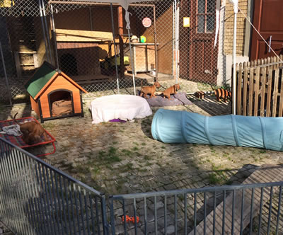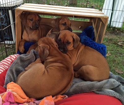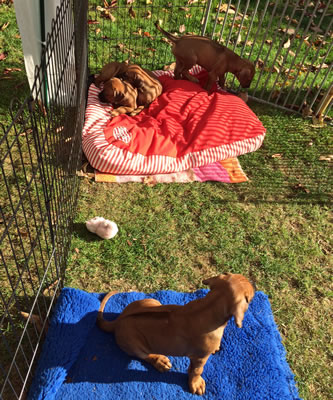 ...wie zuhause ziehen sich die Welpen vorübergehend in die bereitstehende Harrasse zurück